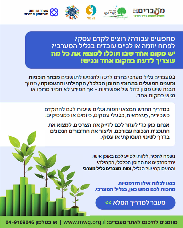 אנחנו שמחים להשיק מדריך חדש, המרכז בצורה בהירה ונגישה מקבץ של תוכניות מובילות, מענים וכלים הזמינים כיום במעלה יוסף - עבור שכירים, בעלי ובעלות עסקים, יזמים ויזמיות, וכן מעסיקים.המדריך נבנה מתוך היכרות עמוקה ועבודה מתמשכת בשטח, ובשיתוף פעולה עם מרבית התוכניות והגופים הפועלים במרחב. הוא נועד לאפשר לכל תושב, עסק ומעסיק להיחשף להזדמנויות, לתמיכות ולמסלולי ליווי - הנמצאים ממש כאן, קרוב לבית.